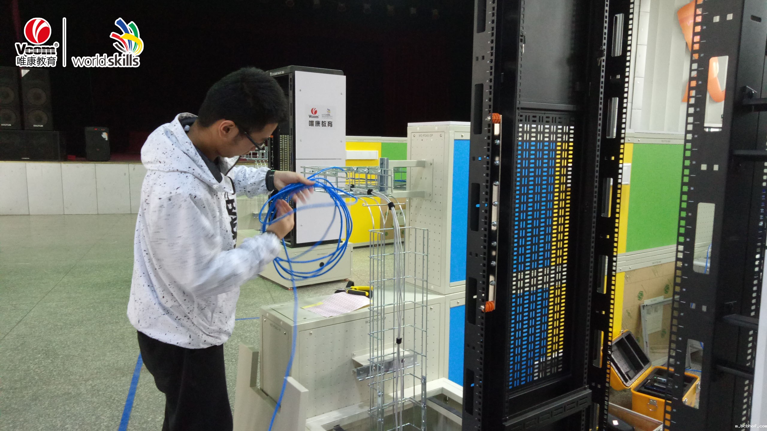 信息网络布线项目是指利用以太网技术、局域网技术和办公室/家庭网络技术,进行大楼综合布线(包括主干和水平)、住宅和办公楼综合布线(办公室和家庭布线)和场外综合布线的竞赛项目。选手要根据技术标准的具体要求完成对光纤光缆、铜缆、19寸电缆架的安装,对光纤光缆和铜缆的故障排除,对光纤光缆和铜缆的性能测试以及进行无线技术和网络应用,如:安装Wi-Fi,安装网络(闭路电视、安全系统、摄像头等)。此次赛事标准与世界技能大赛接轨,按照世界技能大赛信息网络布线M2模块(结构化布线)进行竞技选拔。